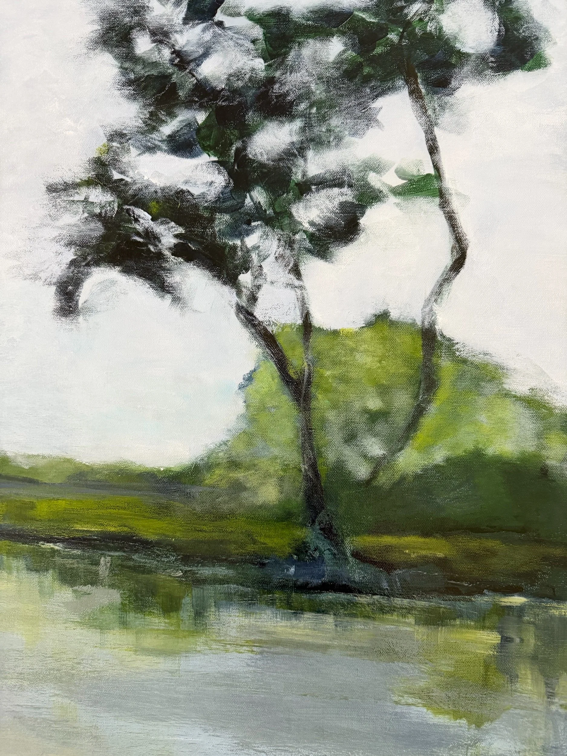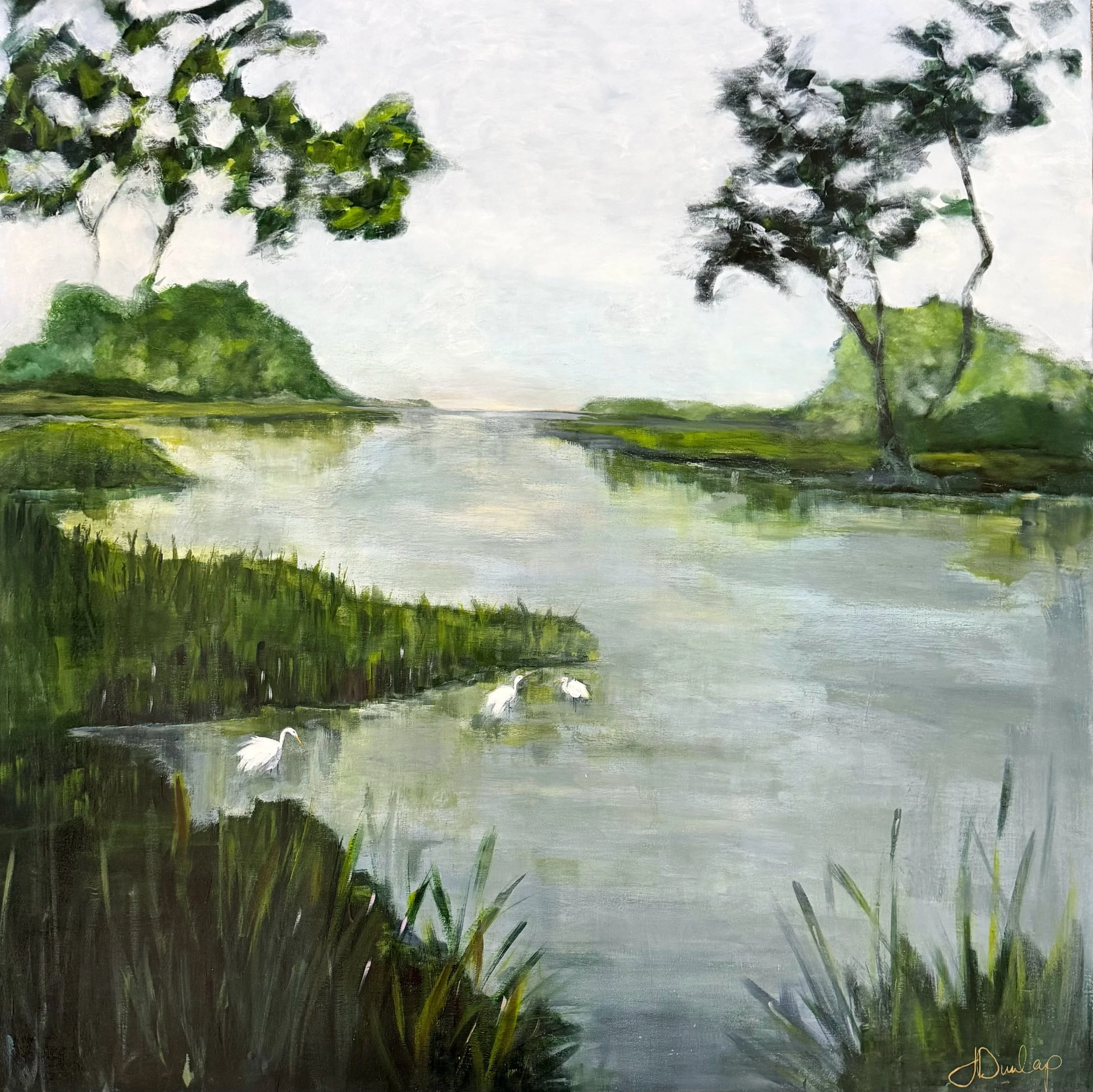This piece captures the quiet stillness of the marsh—the kind that settles in slowly and asks nothing of you. Soft light moves across the water, layered greens ground the landscape, and a small group of egrets rests within it, undisturbed and at ease.